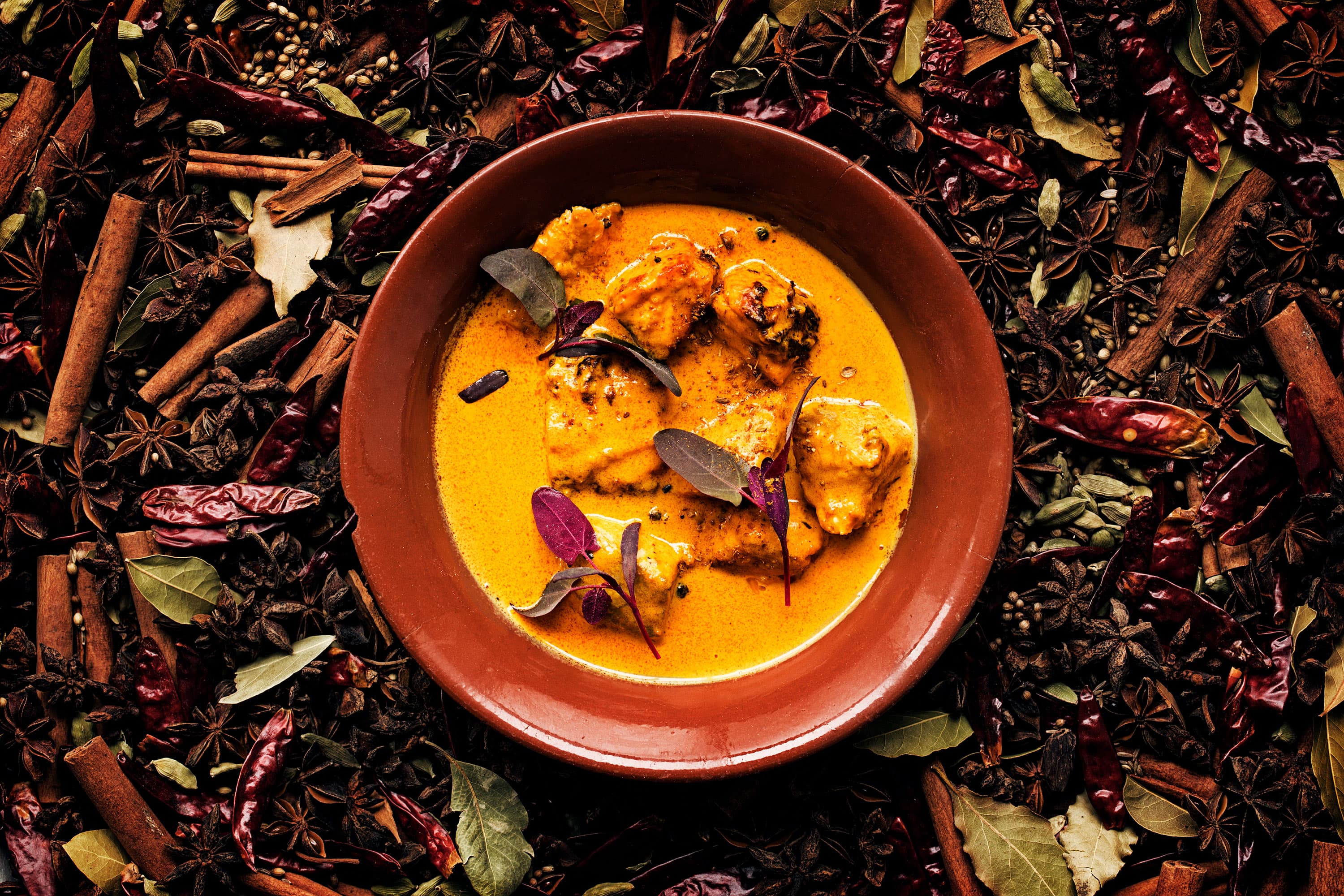 Kycklingfilé i en kryddig gryta. Serveras med basmatiris, sallad och chutney.